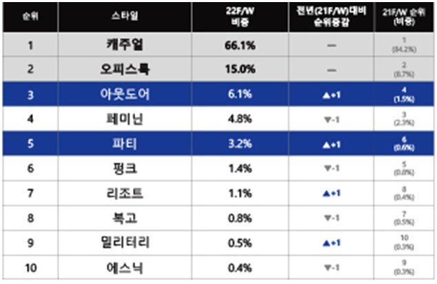 그러나, 팬데믹에서 자유로워진 분위기에 힘입어 아웃도어 스타일, 파티 스타일 등 폭넓은 취향을 반영한 스타일들이 지난 22S/S 시즌부터 상승세를 보이고 있다.