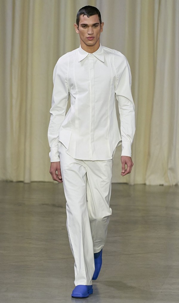 화이트 스타일링에 브라이트한 액센트 컬러를 부분적으로 매치해 스타일을 완성한다.