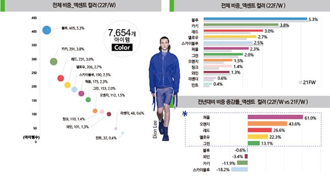 액센트 컬러중에서 특히 퍼플(+61%), 오렌지(+43.6%), 레드(+26.6%), 옐로우(+22.3%), 그린(+13.1%) 컬러가 전년대비 비중이 증가했으며, 키액센트 컬러로 떠올랐다.