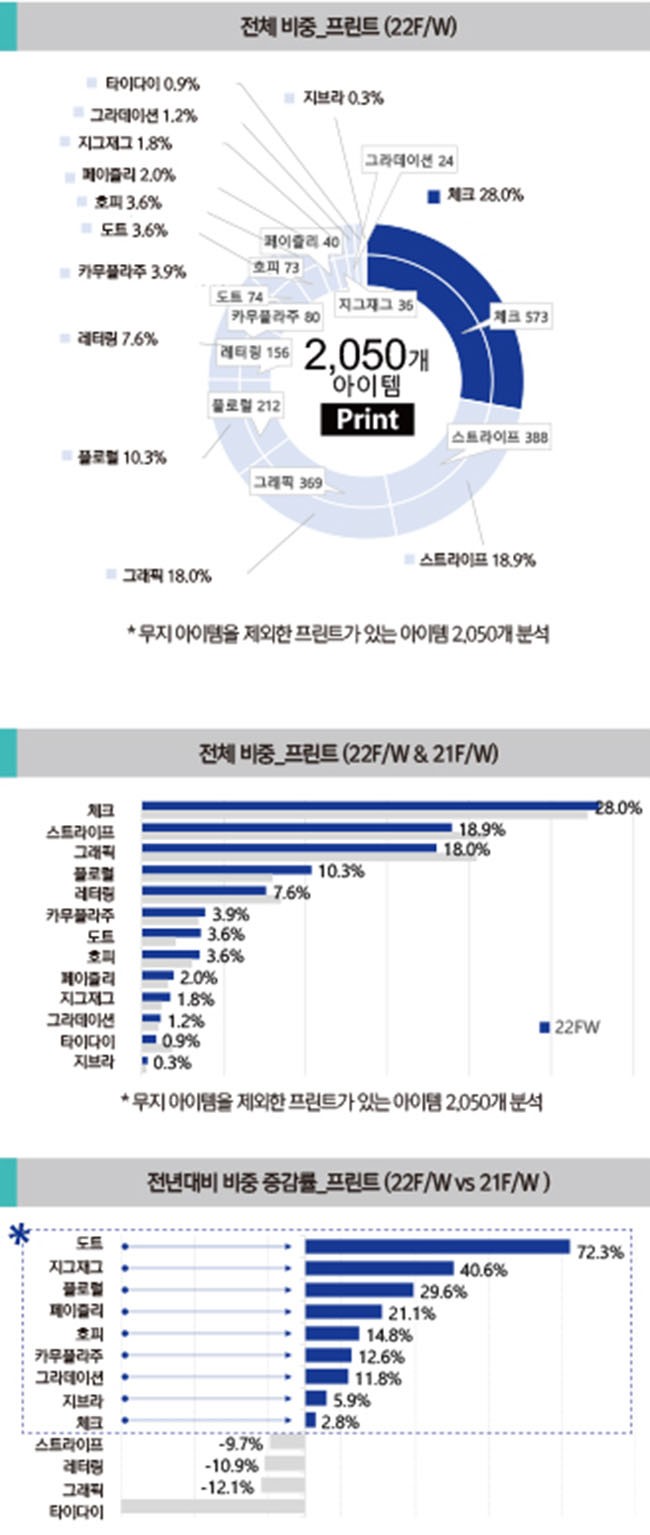 전년대비 체크, 플로럴, 카무플라주, 기하학 패턴 등이 강세를 보이는 것으로 나타났다.