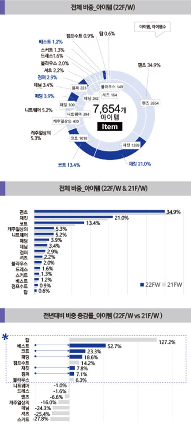 재킷 아이템에서는 포멀한 재킷(+2.6%)이나 오피스룩(+64.7%)에 활용할 수 있는 스타일이 전년대비 비중이 증가하며 새롭게 주목받고 있으며, 캐주얼 재킷중에서는 실용적인 아웃도어 스타일, 파티를 위한 화려한 재킷이 이번 시즌 키아이템으로 떠올랐다.