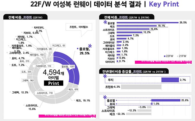 여성복 프린트 중에서는 플로럴 패턴이 프린트 비중 1위 29.5%, 전년대비 증감률에서 +25.6%를 차지하며 키트렌드로 떠올랐다.
