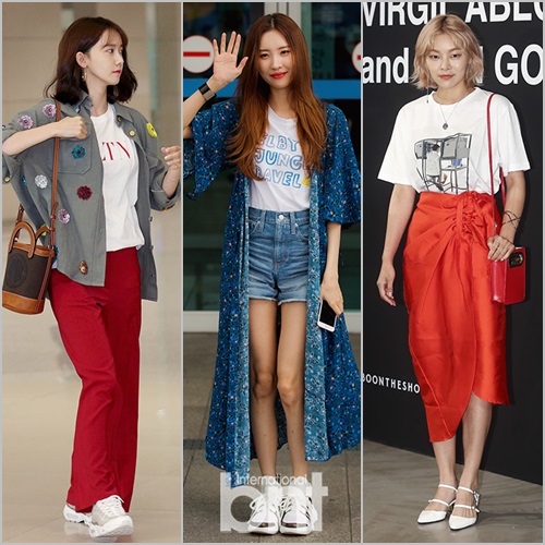 스타들의 룩에서도 예외는 없다. 편안해 보이는 라운드 티셔츠에 레터링과 프린팅된 티셔츠로 자신만의 개성을 드러내며 각각의 스타일링을 선보였다. 공항 패션과 행사장에서 빛났던 윤아-선미-송해나의 화이트 티셔츠 스타일링을 살펴보자.