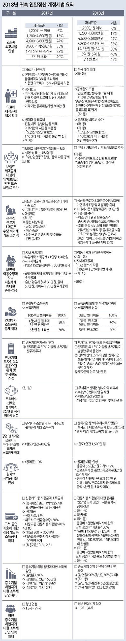 이 밖에 소득세 최고세율에도 변화가 생겼다. 과표 5억원 초과 구간의 세율이 40%에서 42%로 인상되고 3억원~5억원 구간의 세율이 38%에서 40%로 인상된 것.