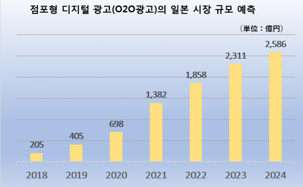 사이버에이전트와 디지털임팩트가 공동으로 실시한 ‘점포 집객형 디지털광고(O2O광고)의 시장 규모 조사’에 따르면, 2019년의 점포 집객 형 디지털 광고 시장 규모는 405억엔으로 2018년의 205억엔에서 약 2배로 확대됐다. 2024년에는 2,586억엔으로 성장할 것으로 예상되고 있다.