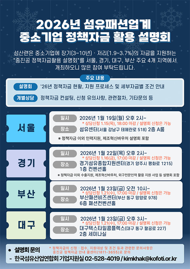 26년 섬유패션업계 중소기업 정책자금 활용 설명회 (01/19 ~ 01/23)