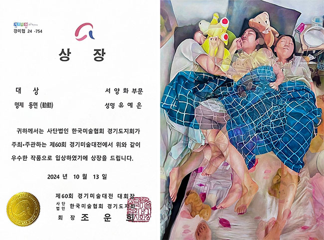 ◆제60회 경기미술대전에서 수원대학교 회화과 회화전공 4학년 유예은 양이 ‘동면’이란 주제로 대상을 수상했다. 사진은 대상 상장과 수상작(오른쪽)