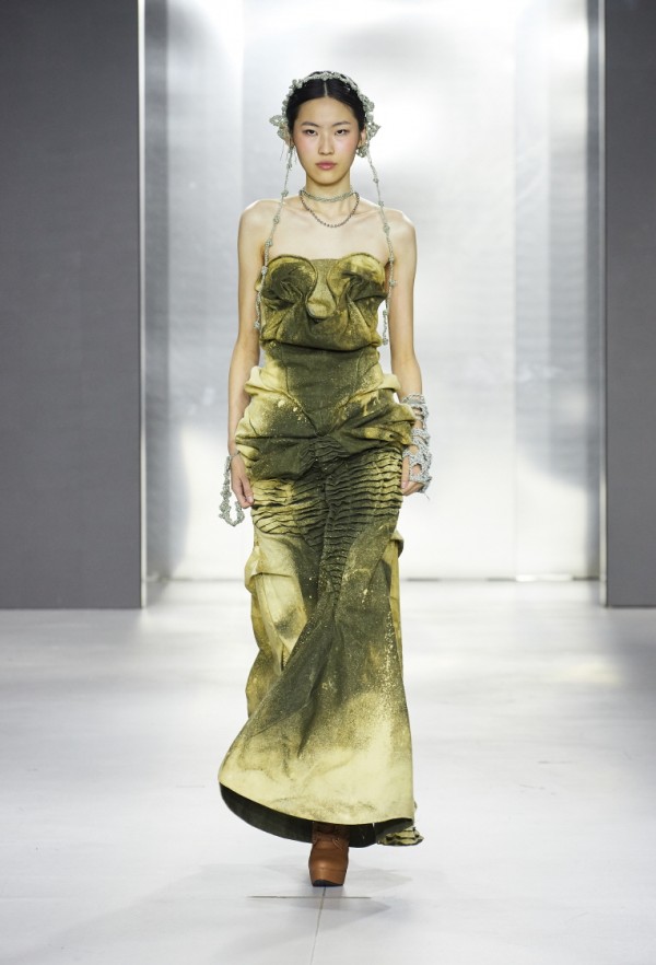 강민서 학생의 작품 ‘RHEA.’는 자연과 인간의 세월의 변화를 아름다움으로 승화시킨 포토그래퍼 알리샤 브로도비치(Alicja Brodowicz)의 ‘VISUAL EXERCISES’라는 작품에서 영감을 받았다. 가죽과 니트를 메인소재로 사용해, 주름과 패턴 확장, 볼륨을 통해 늘어지고 흘러내리는 느낌을 구사하며 '시간의 흐름'을 표현했다. 작품 타이틀인 ‘RHEA.’는 그리스 신화에 등장하는 대지의 여신이라는 뜻.