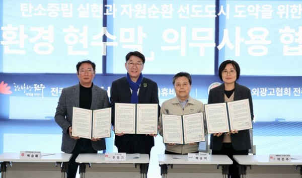 휴비스는 지난 17일, 전주시 전주교육통합지원센터에서 전주시, 옥외광고협회 전주시지부, 새활용센터 다시봄과 함께 '친환경 생분해 현수막 사용 의무화 및 활성화’를 위한 업무협약(MOU)'을 체결했다고 18일 밝혔다. 이날 협약식에는 우범기 전주시장과 백승덕 휴비스 공장장을 비롯해 백승배 옥외광고협회 전주시지부장, 이은주 새활용센터장 등 20여 명이 참석했다.