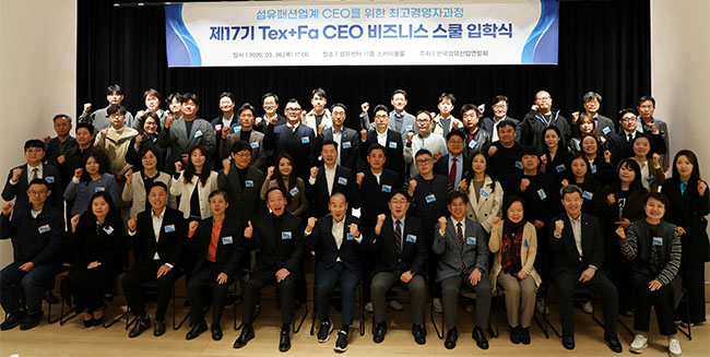 한국섬유산업연합회(이하 섬산련, 회장 최병오)는 지난 26일(목), 섬유센터 17층 스카이볼룸에서 46명의 교육생, 선배 졸업생 대표 등 100명이 참석한 가운데 섬유패션업계 CEO 교육과정인 제17기 ‘Tex+Fa CEO 비즈니스 스쿨’ 입학식을 개최했다.