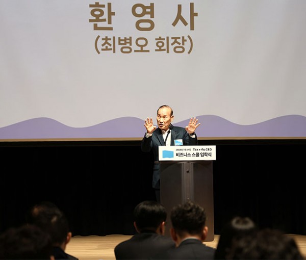 ◆제17기 ‘Tex+Fa CEO 비즈니스 스쿨’ 17기 입학식에서 환영사를 하고 있는 섬산련 최병오 회장.