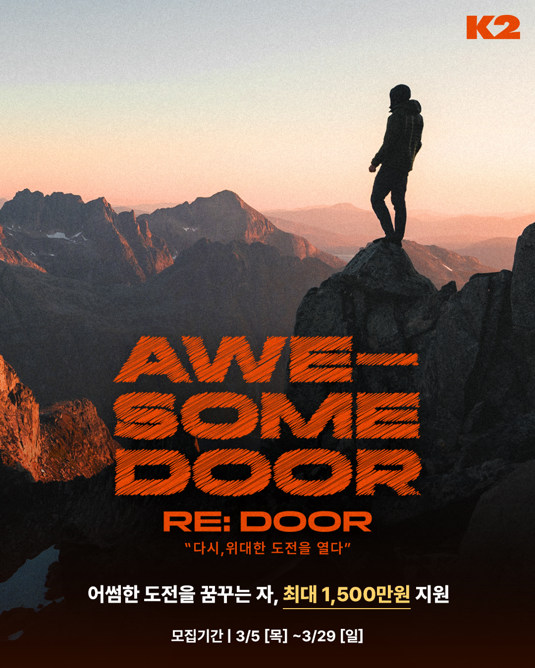 개인 혹은 팀 단위로 총 3팀을 선발하며, 최종 선발된 어썸도어는 활동 계획과 규모에 따라 K2 제품과 지원금을 포함해 최대 1,500만 원까지 지원받게 된다. 모집 기간은 3월 5일(목)부터 3월 29일(일)이며, K2 공식 인스타그램과 홈페이지를 통해 신청 가능하다.