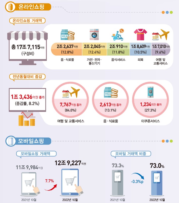 통계청이 최근 발표한 ‘2022년 10월 온라인쇼핑 동향’에 의하면 지난 10월 온라인쇼핑 거래액은 17조 7,115억 원으로 전년동월대비 8.2% 증가했으며, 온라인쇼핑 중 모바일쇼핑 거래액은 12조 9,227억 원으로 7.7% 증가한 것으로 집계됐다.