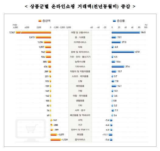 세부 상품군별 온라인쇼핑 거래액은 전년동월대비 음식서비스(-7.6%) 등에서 감소했으나, 여행 및 교통서비스(84.0%), 음‧식료품(13.1%), 이쿠폰서비스(27.3%) 등에서 증가했다. 전월대비로는 자동차 및 자동차용품(-52.4%) 등에서 감소했으나, 가전‧전자‧통신기기(27.8%), 의복(26.3%), 음식서비스(7.0%) 등에서 증가했다.