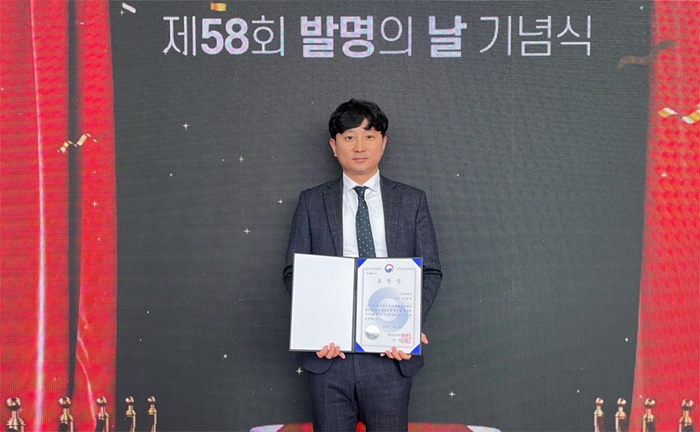 휴비스 R&D센터 이현영 연구원이 지난 12일 코엑스에서 열린 ‘제58회 발명의 날’ 기념식에서 수상 후 기념사진을 촬영하고 있다.