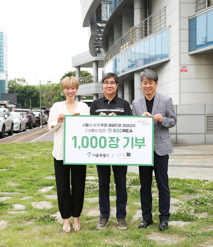 신성통상(대표 염태순) SPA 브랜드 ‘탑텐(TOPTEN10)’이 서울시에 친환경 재생섬유 의류 ‘탑텐 에코리아'를 제작지원하고 5월 24일, 전달식을 진행했다. 이번 전달식은 탑텐과 서울시의 업무협약에 대한 두 번째 성과로 탑텐은 서울시에서 수거된 투명 폐페트병을 활용한 재생섬유 ’에코리아‘로 여름용 반팔 티셔츠를 제작, 서울시 소재 재활용 선별시설 및 서울도시금속(SR, Seoul. Resource)센터의 현장근무자들에게 전달했다.