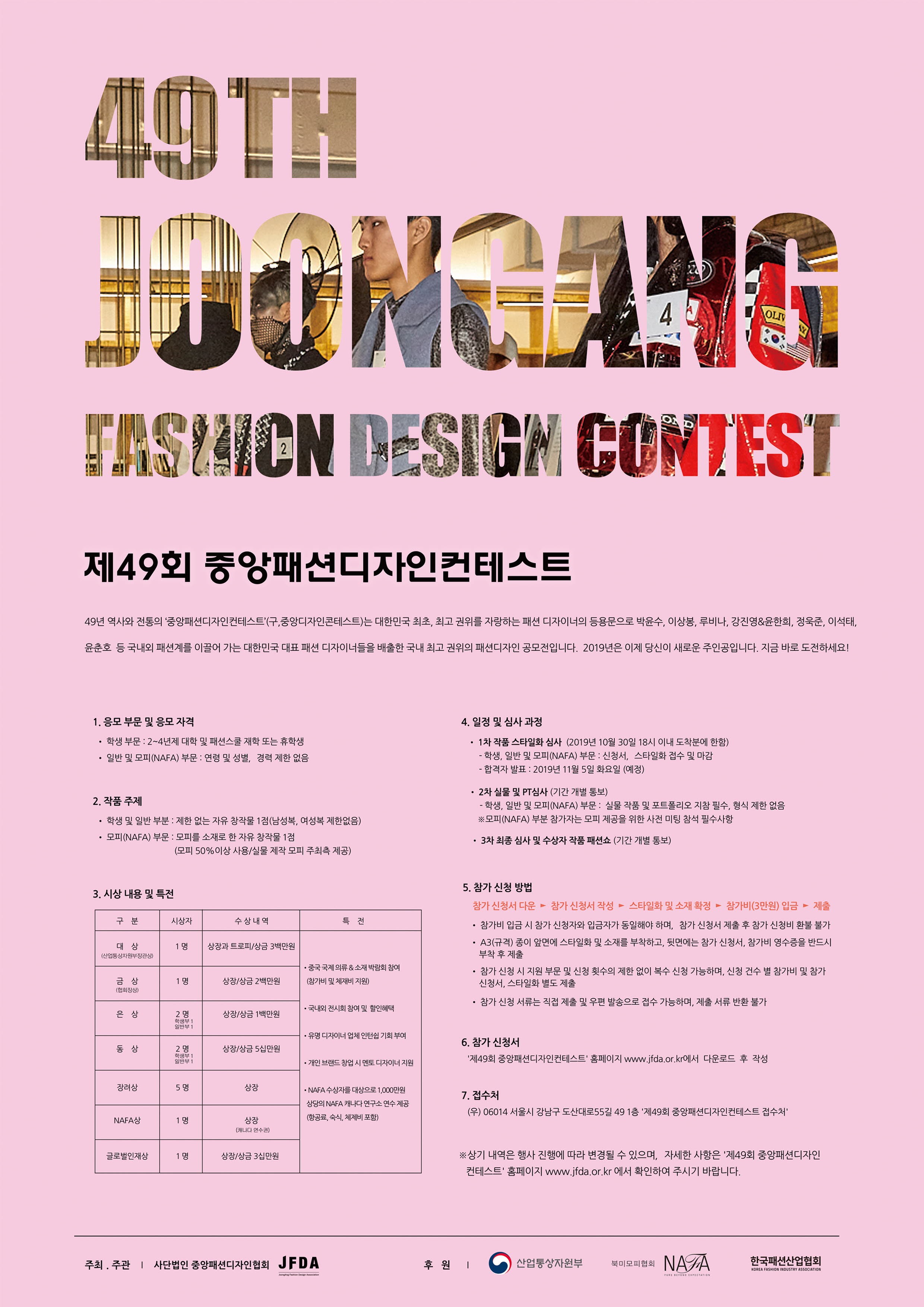 참가 신청 마감은 2019년 10월 30일까지 이며 자세한 내용은 ‘제49회 중앙패션디자인컨테스트’ 홈페이지