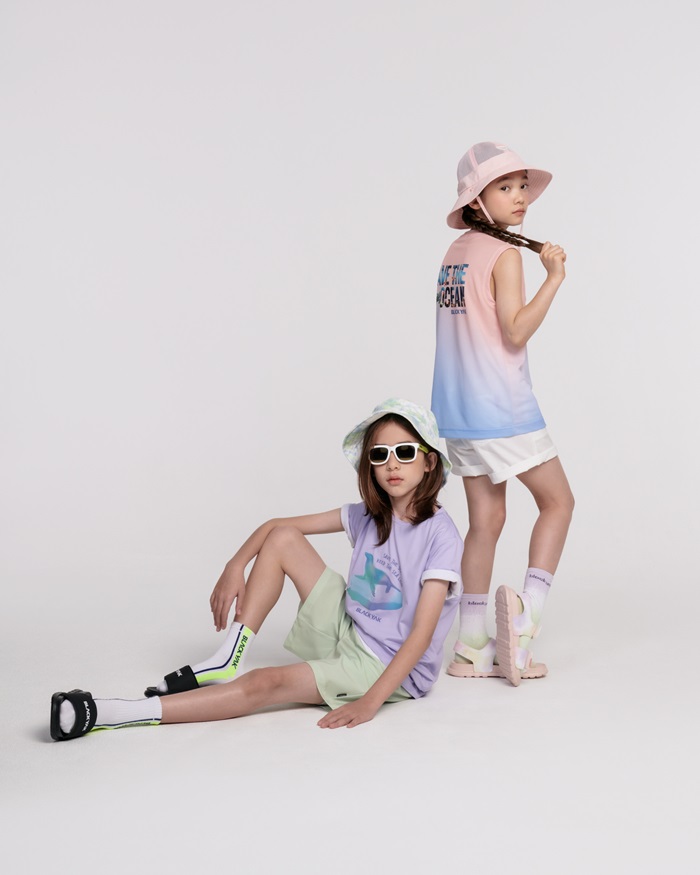 대표 제품인 ‘BK스텝오션5부세트’는 가볍고 신축성이 우수한 반팔 티셔츠와 5부 반바지 셋업이다. 티셔츠 가슴 부위에는 파스텔 톤의 돌고래, 물개 등 해양 생물 그래픽과 ‘SAVE THE SEA’ 레터링 포인트가 화사함을 더했다. 무릎까지 오는 허리 밴드형 반바지는 속팬티가 있어 물놀이에도 안정적으로 입을 수 있다. 민트, 라벤더, 블랙 구성으로, 상하의를 따로 또 같이 연출할 수 있어 활용도가 높다. 남아와 여아 모두 입을 수 있다.