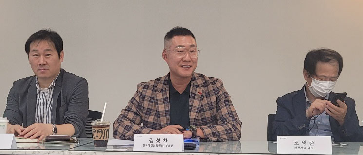 ◆한국패션산업협회는 지난달 31일 오전 11시 섬유센터 16층 회의실에서 기자 간담회를 가졌다(사진 가운데 김성찬 부회장) .