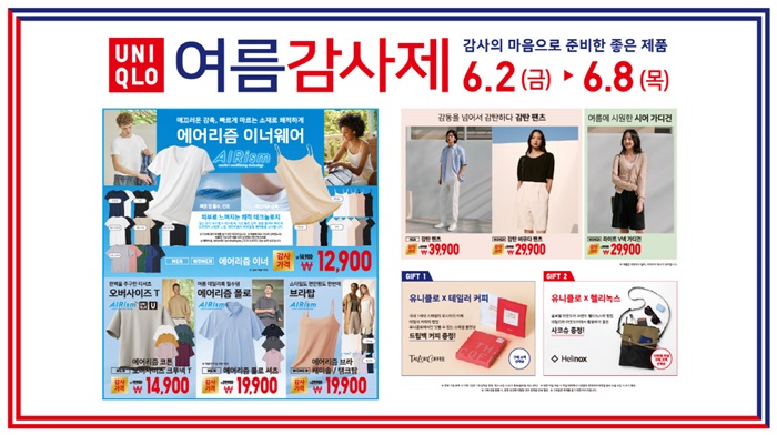전국 유니클로 매장과 온라인 스토어에서 진행되는 ‘유니클로 여름 감사제’에서 유니클로 여름철 대표 아이템인 에어리즘 제품을 할인된 가격에 만나볼 수 있다. 남성용, 여성용, 키즈 에어리즘 이너웨어를 비롯하여, 남성용 에어리즘 폴로셔츠, 여성용 에어리즘 코튼이지 쇼트팬츠 및 키즈 에어리즘 티셔츠 등 다양한 에어리즘 라인업을 감사제 기간동안 합리적인 가격으로 구매할 수 있다.