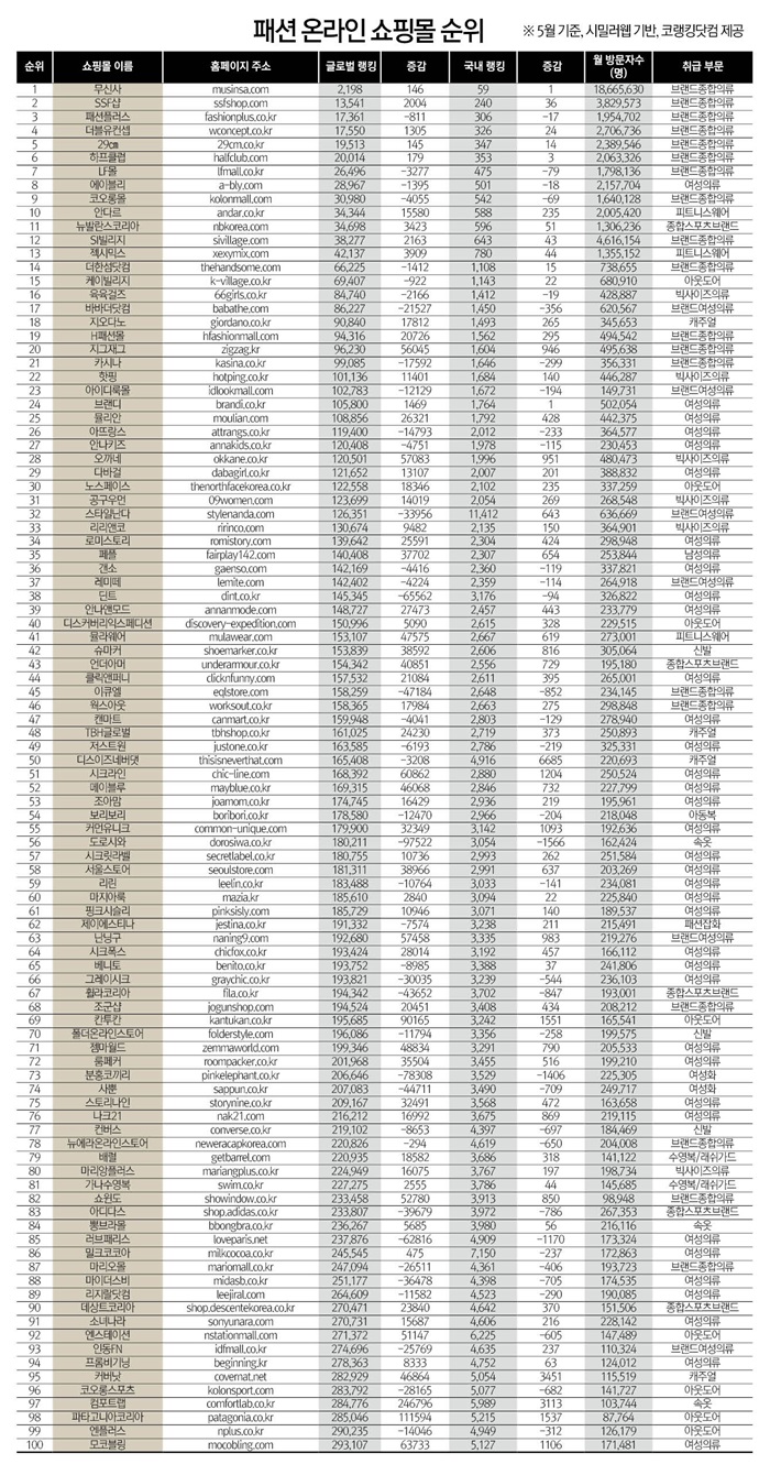 www.koranking.com)의 협조를 받아 조사한 ‘5월 패션 온라인 쇼핑몰 순위’에 의하면 100위권 쇼핑몰 중 글로벌 랭킹이 전월 대비 상승한 쇼핑몰은 61개에 달했다. 이는 지난 4월 40개에 비해 크게 증가한 것이다.
