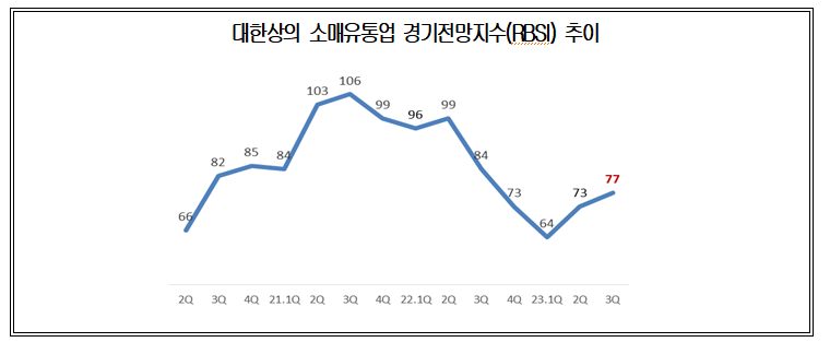 대한상공회의소(회장 최태원)는 소매유통업체 500개사를 대상으로‘3분기 소매유통업 경기전망지수(RBSI)’를 조사한 결과, 전망치가 ‘77’로 집계됐다고 10일 밝혔다.
