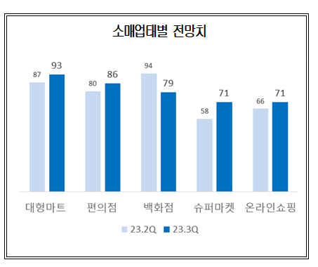 모든 업태가 기준치(100)를 하회한 가운데 대형마트(87→93)가 가장 높은 전망치를 보였다. 편의점(80→86), 슈퍼마켓(58→71), 온라인쇼핑(66→71)도 경기 회복에 대한 기대감이 상대적으로 높아진 반면, 백화점(94→79)만 유일하게 기대감을 낮췄다.