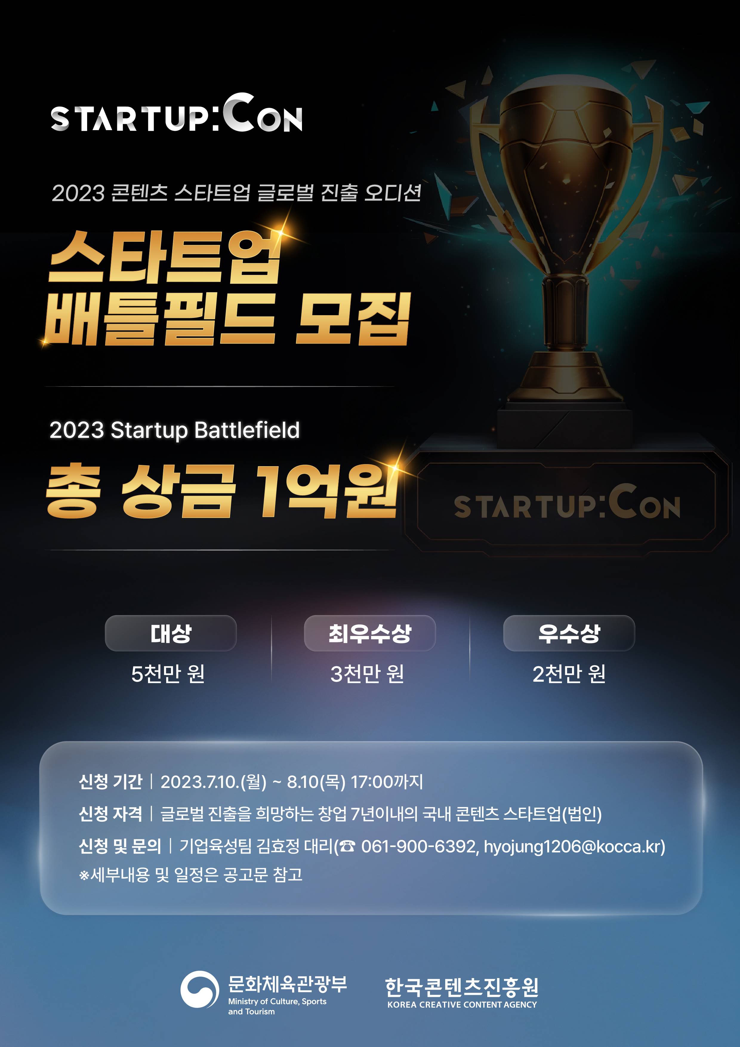 문화체육관광부(장관 박보균)와 한국콘텐츠진흥원(원장 조현래, 이하 콘진원)이 ‘2023 스타트업콘(Startup:CON, 이하 스타트업콘)’에서 콘텐츠 스타트업의 글로벌 진출 오디션 ‘배틀필드’에 참가할 기업을 다음달 10일까지 모집한다.
