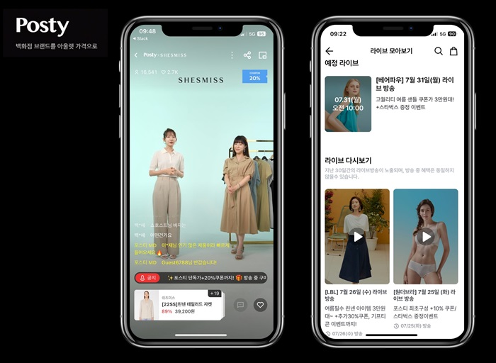 포스티 앱 내에서 간편하게 시청할 수 있는 라이브 방송은 홈쇼핑에 익숙한 4050세대를 성공적으로 공략하고 있다. 직접 만져보고 입어볼 수 없는 온라인 쇼핑의 한계점을 개선함과 동시에 재미를 더한 예능형 콘텐츠로 다채로운 쇼핑 경험을 제공하고 있는 것.