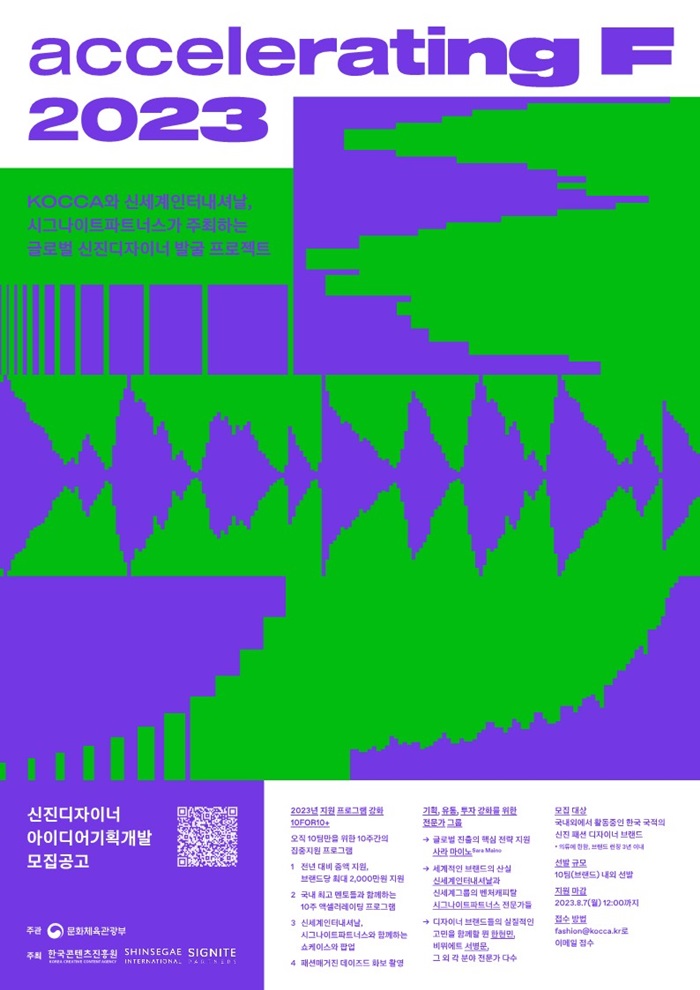 문화체육관광부(장관 박보균)와 한국콘텐츠진흥원(이하 콘진원, 원장 조현래)이 신진 디자이너 발굴 및 프로젝트 ‘액셀러레이팅 F(Accelerating F)'에 참가할 디자이너를 8월 7일까지 모집한다.