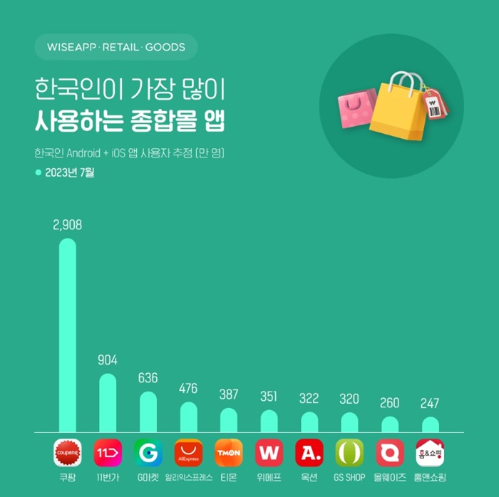 앱/리테일 분석 서비스 와이즈앱·리테일·굿즈가 한국인 스마트 사용자(Android+iOS)를 표본 조사한 결과, 지난 7월 한국인이 가장 많이 사용한 종합몰 앱은 쿠팡으로 2,908만 명이 사용한 것으로 조사됐다.