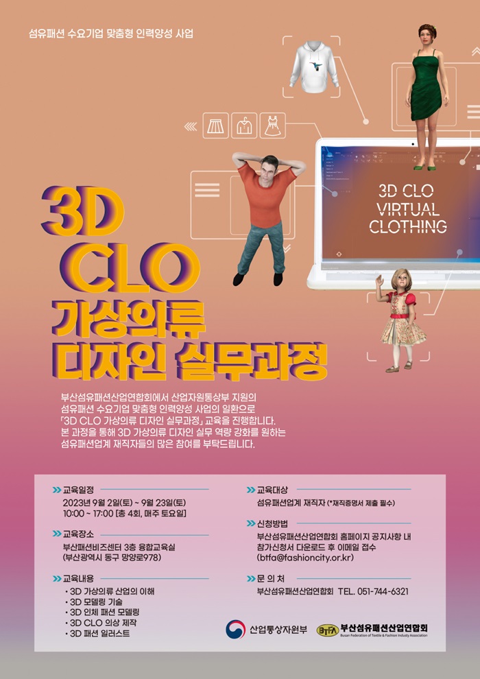 CLO 3D 프로그램을 활용한 교육으로 9월 2일부터 23일까지 매주 토요일 10:00~17:00에 부산패션비즈센터 3층 융합교육실에서 실시한다.