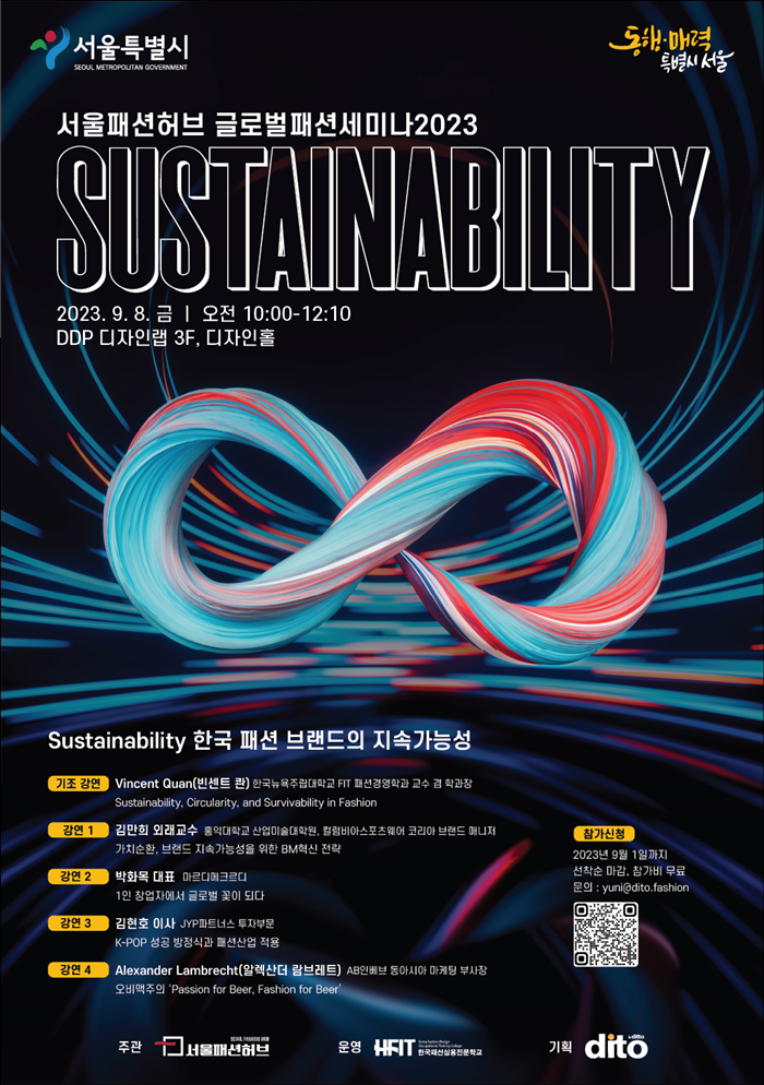 서울시가 오는 9월 8일 DDP 디자인랩 3층에서 ‘Sustainability’를 주제로 ‘2023 글로벌 패션 세미나(Global Fashion Seminar)’를 개최한다. 이 행사는 서울패션위크 트레이드쇼 연합행사로서 서울패션허브 배움뜰이 주관하고, 한국패션실용전문학교가 운영을, 디토앤디토가 기획했다.