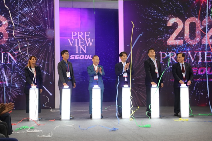 ‘프리뷰 인 서울 2023’ 개막식에 참석한 VIP들이 개막식 버튼을 누르고 있다. 사진 왼쪽부터 팀버랜드 실비아심치크 디자이너, 일송텍스 신일호 대표, 한국섬유산업연합회 최병오 회장, 산업통상자원부 주영준 실장, 서울시 송호재 기획관, VITAS 부득지앙 회장