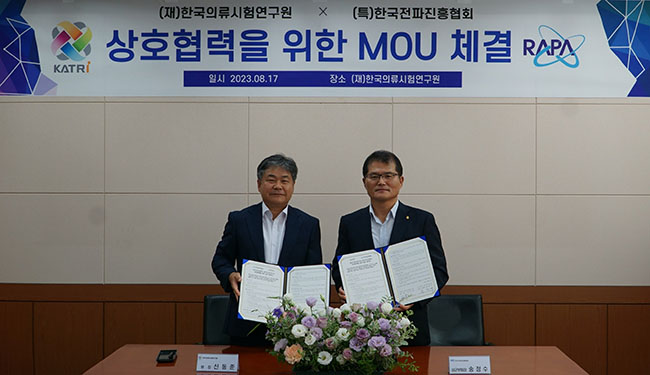 한국의류시험연구원(KATRI, 원장 신동준)은 17일 한국전파진흥협회(RAPA, 부회장 송정수)와 상호협력 체제를 구축하고 양 기관의 기술발전과 시험인증분야 교류를 위한 업무협약(MOU)을 체결했다.