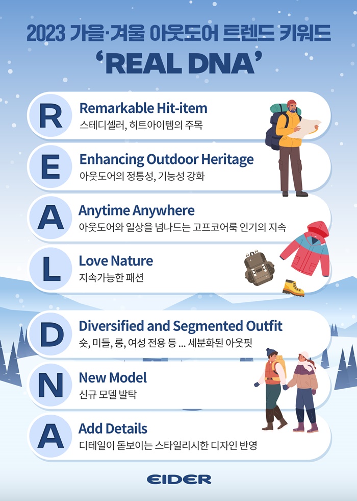아웃도어 패션 브랜드 '아이더'는 2023년 가을, 겨울 아웃도어 업계 키워드로 ‘REAL DNA’를 제시하며 올 하반기 트렌드를 전망했다.