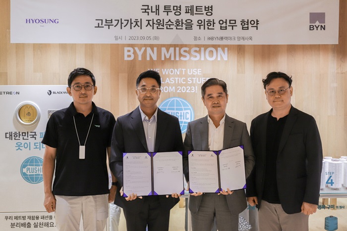 BYN블랙야크그룹(회장 강태선, 이하 블랙야크)이 자사의 투명 페트병 자원 순환 시스템 확대를 위해 효성티앤씨(이하 효성)와 업무 협약을 체결했다.