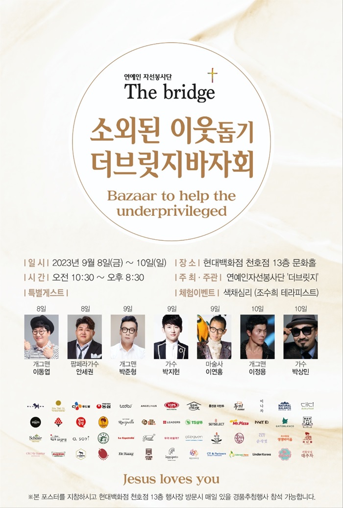 9월 8일부터 10일까지 현대백화점 천호점 13층 문화홀에서 진행되는 ‘더브릿지’ 바자회는 개그맨 이동엽과 박준형을 비롯해 팝페라 가수 안세권, 가수 박지헌과 박상민, 마술사 이연홍 등이 참여한다. 블루독과 블루독베이비 외에도 농심, CJ 푸드빌, 롯데GRS 등 약 52개의 많은 기업들이 참여해 힘을 보탰다. 3일간 현장에서는 경품 행사, 색채심리&감정 오일 테스트 등 다양한 이벤트도 진행된다.