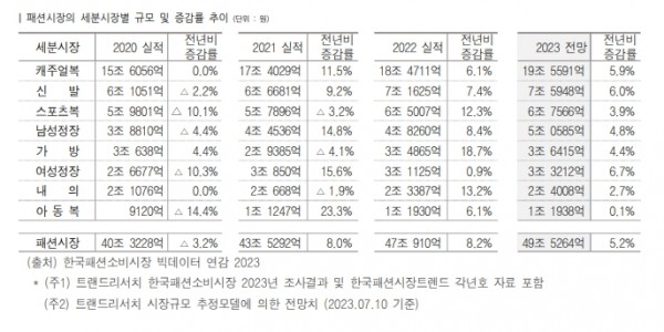국내 패션시장은 2023년에도 3년 연속 플러스 성장을 기대하고 있고, 캐주얼복, 신발, 스포츠복, 여성정장 시장이 성장을 주도할 것으로 예측되었다.