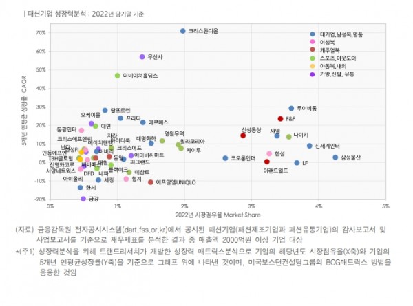 국내 기업으로는 무신사, 더네이쳐홀딩스가 미래 시장지위가 높은 상위그룹으로 평가됐고, 한섬, 신세계인터내셔날(그룹)도 성장력 상위그룹으로 랭크됐다. 반면, 삼성물산(패션사업)과 LF(그룹), 이랜드월드, 코오롱인더스트리(패션사업) 등 토종 대기업은 외자기업에 비해 사업 성장세가 정체된 것으로 평가됐고, 금강그룹, 한세(내수그룹), 세정(그룹), 형지(패션그룹)는 성장이 침체된 기업군으로 평가됐다.