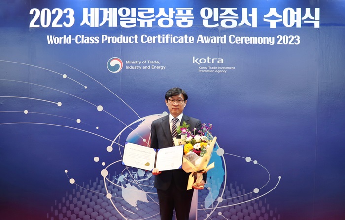 휴비스 강형모 Fiber사업본부장이 지난 9일, 서울 강남구 그랜드 인터컨티넨탈 서울 파르나스에서 진행된 2023 세계일류상품 인증서 수여식에서 기념사진을 촬영하고 있다.
