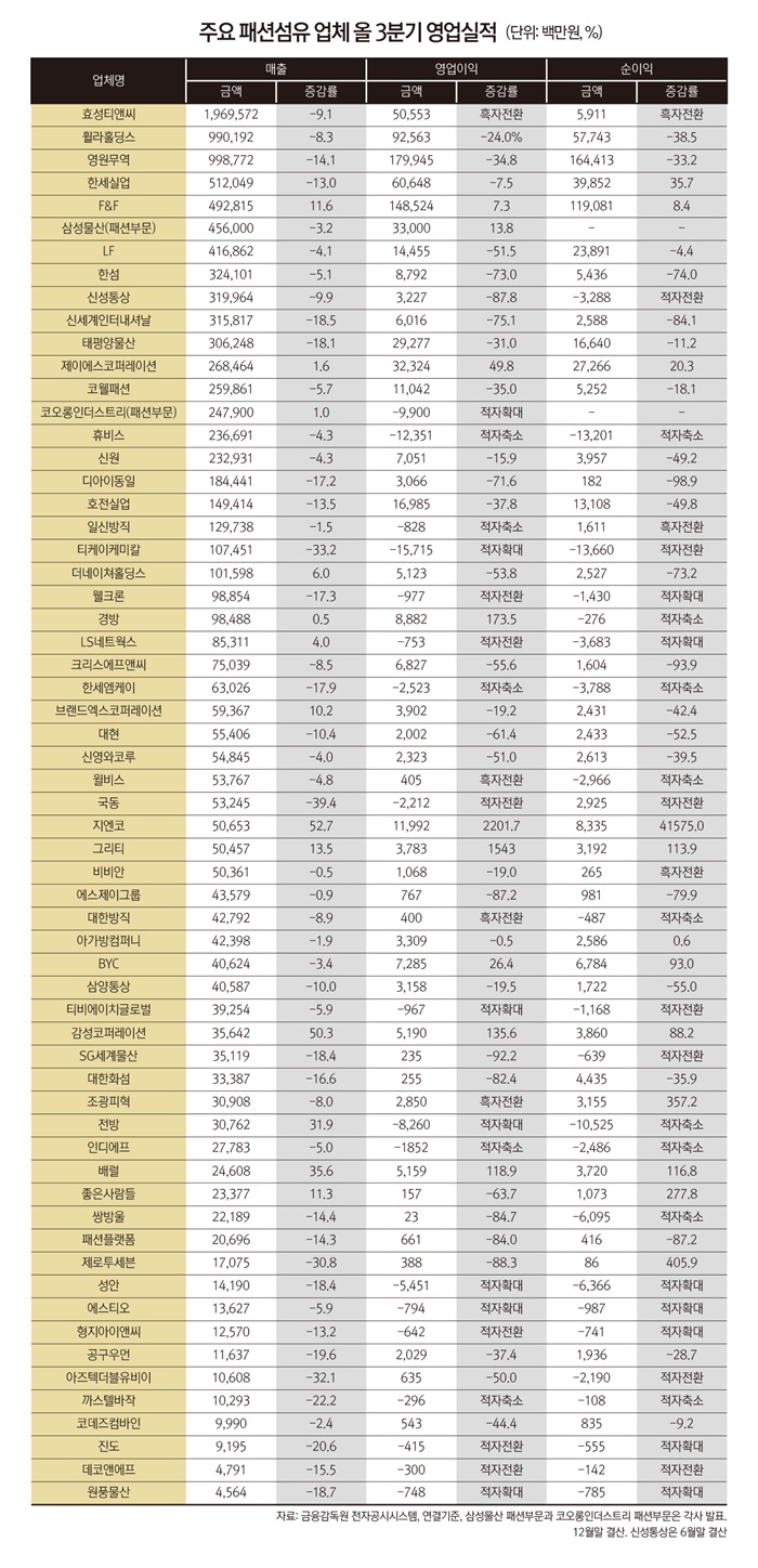삼성물산 패션부문은 올해 3분기 매출액은 4560억 원으로 전년비 3.2% 감소했고, 영업이익은 330억 원으로 13.8% 증가했다. 삼성물산 패션부문은 지난 몇 년간 지속해 온 체질 개선이 효력을 발휘하면서 패션 대기업 중 유일하게 영업이익이 증가했다. LF는 매출액은 4169억 원, 영업이익은 145억 원을 기록, 각각 4.1%, 51.4% 감소했다. 경기침체에 따른 의류 수요 감소와 수입 신규 브랜드의 마케팅 비용 증가, 부동산 업황 부진에 따른 코람코자산신탁의 매출 감소가 영향을 미쳤다는 분석이다.