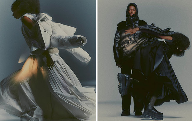 몽클레르 X 사카이 컬렉션은 일본 브랜드의 하이브리드적 미학과 몽클레르의 아웃도어 정신을 결합한다. 테일러링과 포멀함이 현실성과 접목되고 여성스러움과 실용성이 결합하여 새로운 형태와 기능을 만들어낸다.
