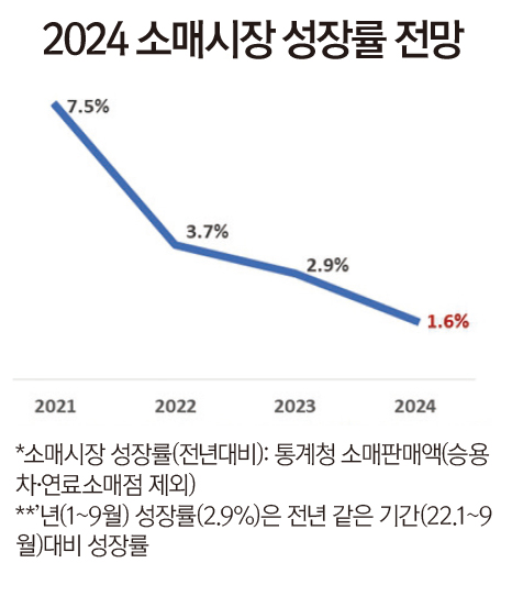 이날 대한상의가 소매유통기업 250개사를 대상으로 시행한 ‘2024년 소비시장 전망 조사’ 결과에 따르면, 내년 소매시장은 올해 대비 1.6% 성장에 머물 것으로 집계됐다.