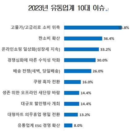 유통기업 250개사를 대상으로 시행한 ‘2023년 유통업계 10대 이슈’ 조사에서는 올해 업계 최대 핫이슈로 고물가·고금리에 따른 소비심리 위축(54.8%)’이 1위로 꼽혔다.