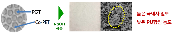 기존 비건 스웨이드 소재 제조 시 가장 큰 기술적인 문제는 가죽의 표면감을 구현하기 위해 폴리에스터계 극세섬유를 사용하는데 있어 알칼리 감량공정에 의해 알칼리 이용성 수지뿐만 아니라 폴리에스터 섬유까지 일부 감량되어 원단의 극세사 밀도를 높이는 데 한계가 있다는 점이었다. 또한, 낮은 극세사 밀도를 보완하기 위해서는 폴리우레탄 수지의 사용량이 늘어날 수밖에 없는데 이로 인해 원단의 내광성이 낮아 고품질의 제품을 제조하기 어려웠다.
