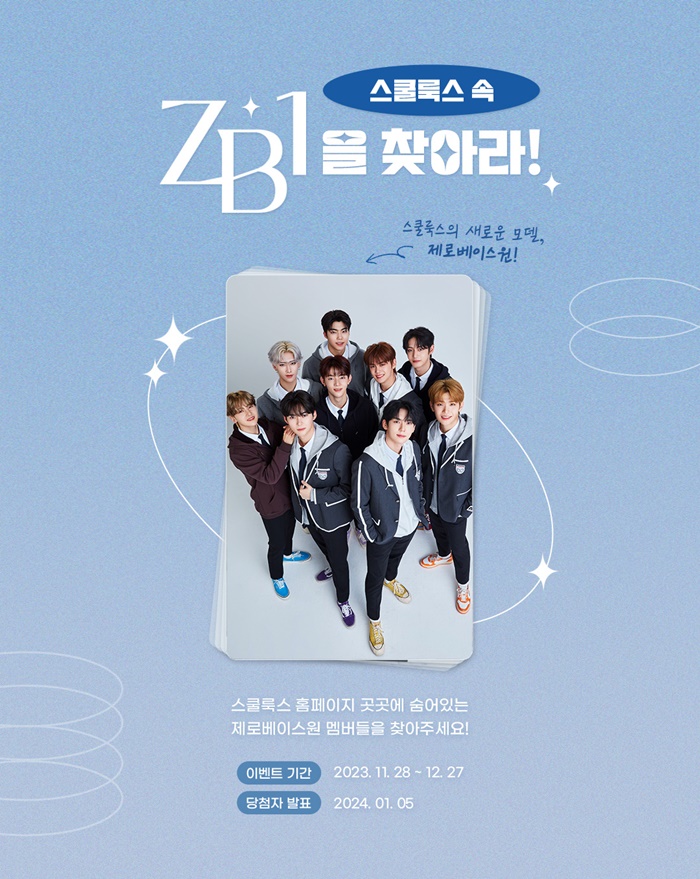 학생복 브랜드 ‘스쿨룩스’가 ZEROBASEONE(제로베이스원) 모델 선정을 기념해 오는 27일까지 자사 공식 홈페이지에서 ‘스쿨룩스 속 ZB1을 찾아라!’ 이벤트를 실시한다.