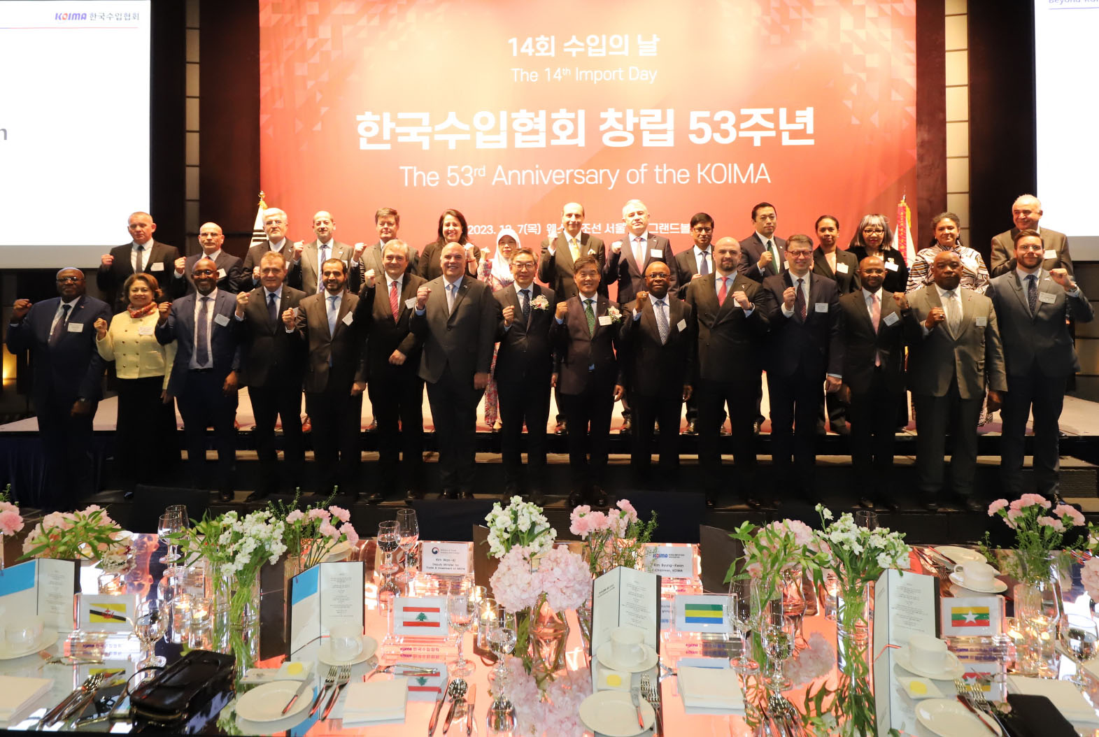 한국수입협회(KOIMA, 회장 김병관)는 7일 오후 서울 웨스틴 조선 호텔에서 인도, 튀르키예 등 80개국의 주한외국대사 및 상무관, 산업통상자원부 등 유관부처를 포함해 경제단체장, 수입업계 대표 등 300여명이 참석한 가운데 ‘창립 53주년 및 제14회 수입의 날’ 기념식을 개최했다.