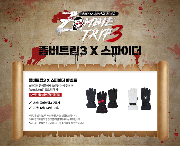 스파이더 공식 온라인몰에서 20만 원 이상 구매 후, 이벤트 코드란에 ‘zombietrip3’ 입력 시 10만 원 상당의 방한장갑을 증정한다. 방한장갑은 남, 여 사이즈 선택이 가능하며 컬러는 랜덤으로 발송된다. 함께 사은품은 선착순으로 증정되며 소진 시, 조기 종료될 수 있다.