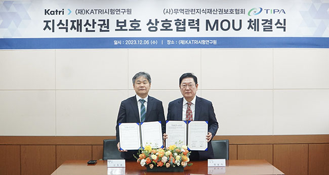 KATRI시험연구원(원장 신동준, 이하 카트리)은 (사)무역관련지식재산권보호협회(회장 정남기, 이하 TIPA)와 지난 6일 진품·가품 감정분야 기술협력에 관한 업무협약을 체결했다.